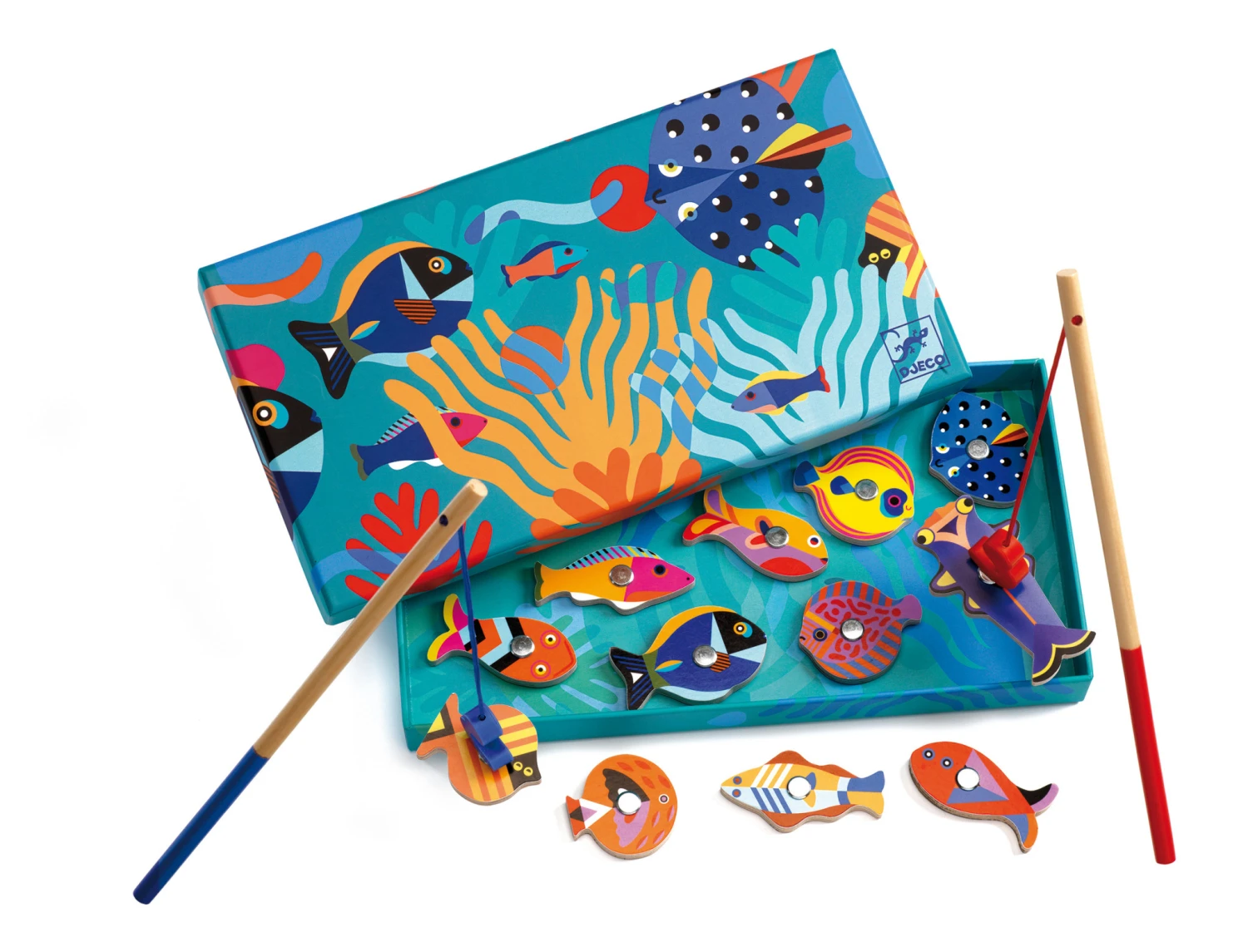Kinderspellen – Educatieve houten spel, magnetisch visspel tropische vissen (Fishing graphic) van het merk Djeco is een houten magnetisch visspel met allemaal verschillende tropische vissen die je kan vangen met de hengels die erbij zitten.