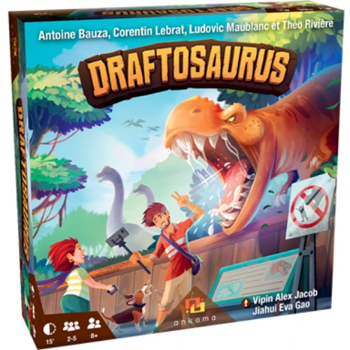 Draftosaurus is een snel en lichte drafting game waarin je een stel dino-meeples in de palm van je hand, nadat je er een heb gekozen, rondgeeft aan de volgende speler.